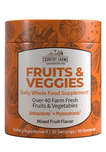 Get your daily fruits and vegetables in one delicious gummy. Country Farms Fruits & Veggies Gummies deliver a concentrated blend of real fruit and vegetable extracts designed to support your body's natural defense system — because busy schedules shouldn't mean skipping nutrition.